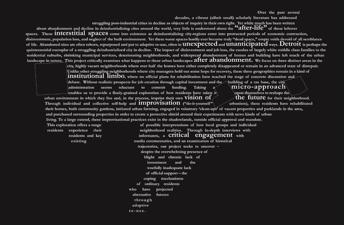 Supported by the Michigan-Mellon Project on the Egalitarian Metropolis, “Mapping the Egalitarian Metropolis: Spaces of Hope” featured work by six interdisciplinary research teams led by University of Michigan Taubman College faculty, each using techniques of deep mapping, critical cartography, and community engagement to reveal planned and unplanned places within Detroit. The contribution by Marc Norman, Kunheng Han and Colin Brown rethinks common tropes applied to the City of Detroit to contextualize and lift up the unique aspects of the city and the region.